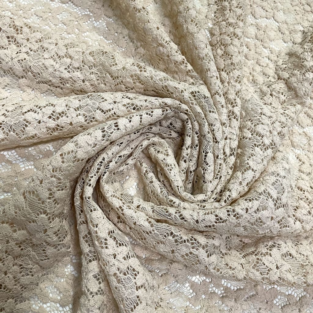 Стрейчевое кружевное полотно имеет очень хорошую растяжимость. Ткань имеет чуть более объемную лицевую сторону. Выткана единым полотном с цветочными мотивами. Хорошо стирается и практически не требует утюжки. Подходит для пошива праздничных нарядов для особых случаев, повседневной одежды, нижнего белья. Так же применяется для отдельных элементов платья.